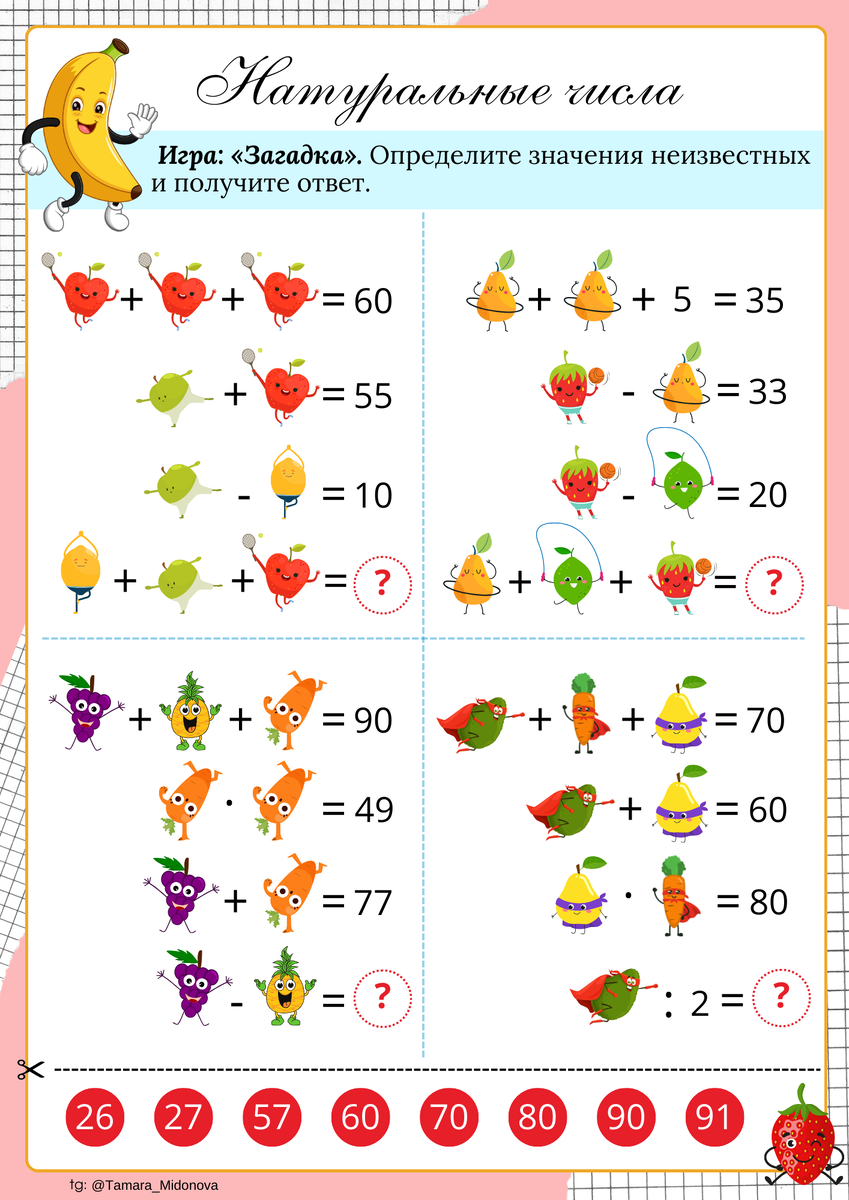 🍎✏️ Игра «Загадка» — определите значения неизвестных и найдите итоговый ответ! 📎 💝 Бесплатно: 🖼 PNG-версия — для печати и интерактивной доски 🧩 Готовая доска в Chattern ❤️ = Спасибо за поддержку! ☕️ Поддержать автора 🫶 Буду рада вашим репостам в Telegram и ВКонтакте ––– 📚 Все материалы #методичка_математика_на_5 #математика #натуральные_числа #уравнения #5класс #chattern