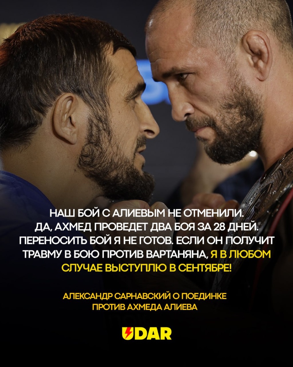 ⚡️Бой Сарнавского и Алиева не отменен! В эксклюзивном интервью каналу UDAR Александр Сарнавский признался, что ни о каком переносе поединка речи быть не может. 💬"Бой не отменили. Я с Камилом не разговаривал, но с матчмейкерами говорили. Алиев согласился на два боя: он подерется 16 августа и потом 14 сентября. Это короткая дистанция, но я думаю, что он понимает риски, которые берет на себя. Я не готов переносить бой с Алиевым: мне сказали, что если он получит травму, я в любом случае выступлю в сентябре!" - отметил Александр. 📺В субботу 16 августа на телеканале UDAR зрители увидят поединок Эдуарда Вартаняна и Ахмеда Алиева в прямом эфире.