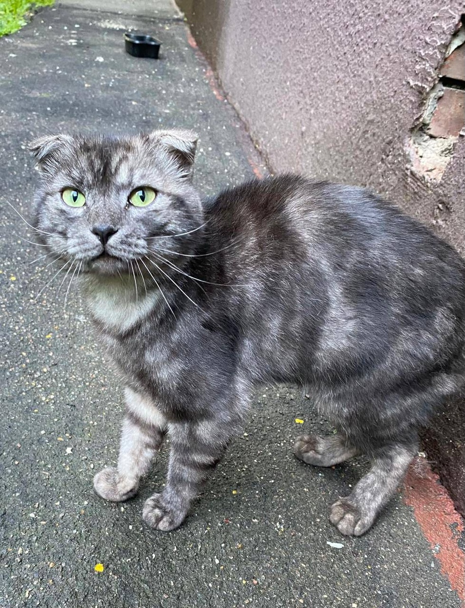 Выкинули породистого котика. Сначала очень боялся, прятался в подвале 5- этажки, со временем привык, сейчас ручной, ласковый. Но ему очень нужен дом. За это время очень похудел, грустный.