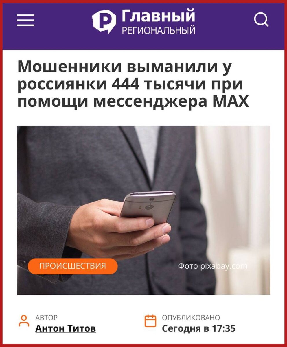 ‼️Через MAX развели на ₽444 тыс 34-летнюю жительницу Курска Обман начался со звонка через новый мессенджер, установленный в телефоне потерпевшей. Незнакомец сообщил о доставке на ее имя посылки и попросил продиктовать код из поступившего смс-сообщения. Даже не ожидая никакой бандероли, курянка передала секретный код постороннему. На неё тут же обрушились звонки из различных госучреждений. Лжесотрудник Роскомнадзора убедил девушку, что предыдущий диалог состоялся с теми, кто пытался похитить её сбережения. Испуганная курянка потеряла контроль. Она установила на смартфон приложение, отправилась к банкомату и совершила первый перевод почти на ₽300 тыс. До последнего потерпевшая полагала, что деньги зачисляются на «безопасную» банковскую ячейку и в скором времени вернутся к ней. Помогли запреты? Это все равно, что бороться с убийствами изымая кухонные ножи, а с изнасилованиями - отрезая причиндалы всем мужикам. Людей учить надо. Но, видимо, кому-то наверху умные граждане не нужны. Ал