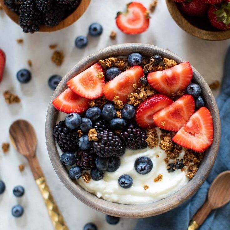 - Выложить йогурт в миску, сверху ягоды и орехи, полить мёдом.