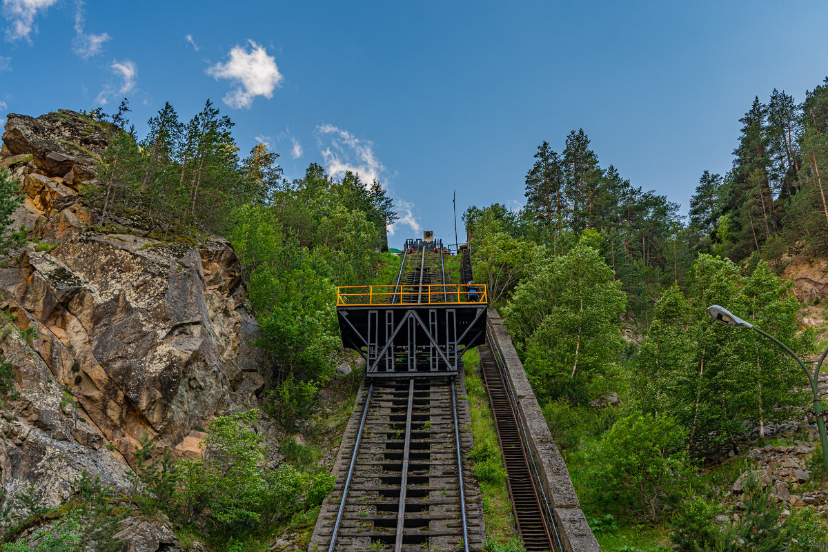 Это необычный инженерный аттракцион, который удивит даже бывалых путешественников. Построенный не то в 60-е, не то в 70-е, он и сегодня остаётся единственным в своём роде в России: огромная металлическая платформа на рельсах поднимает машины и даже автобусы на высокогорное плато.