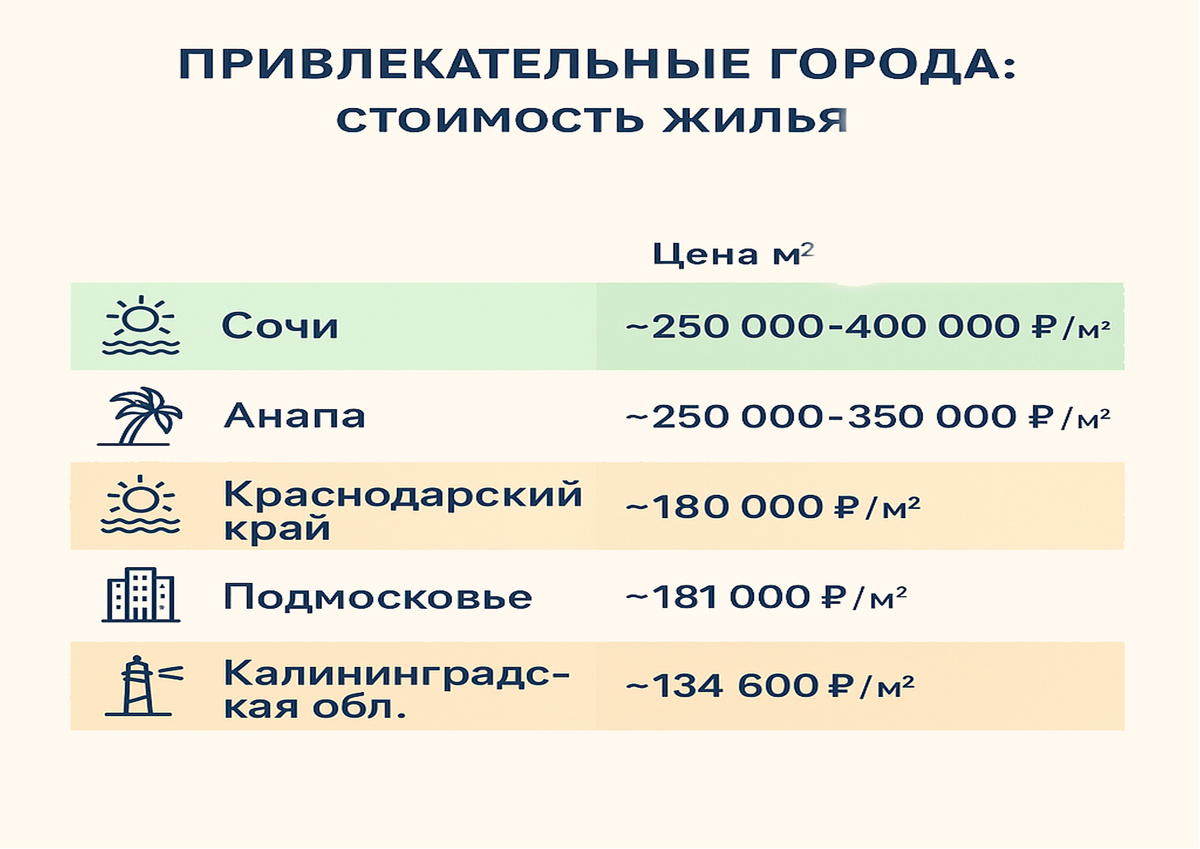 💡 Лайфхак: Если вы мечтаете жить в Сочи, но хотите сэкономить, стоит обратить внимание на близлежащие поселки и спальные районы города. Разница в стоимости жилья между центром и окраинами может достигать 20–30%, при этом качество жизни и доступ к инфраструктуре остаются достаточно высокими. Таким образом, можно совместить комфорт и разумные расходы, не отказываясь от всех преимуществ жизни на Черноморском побережье.