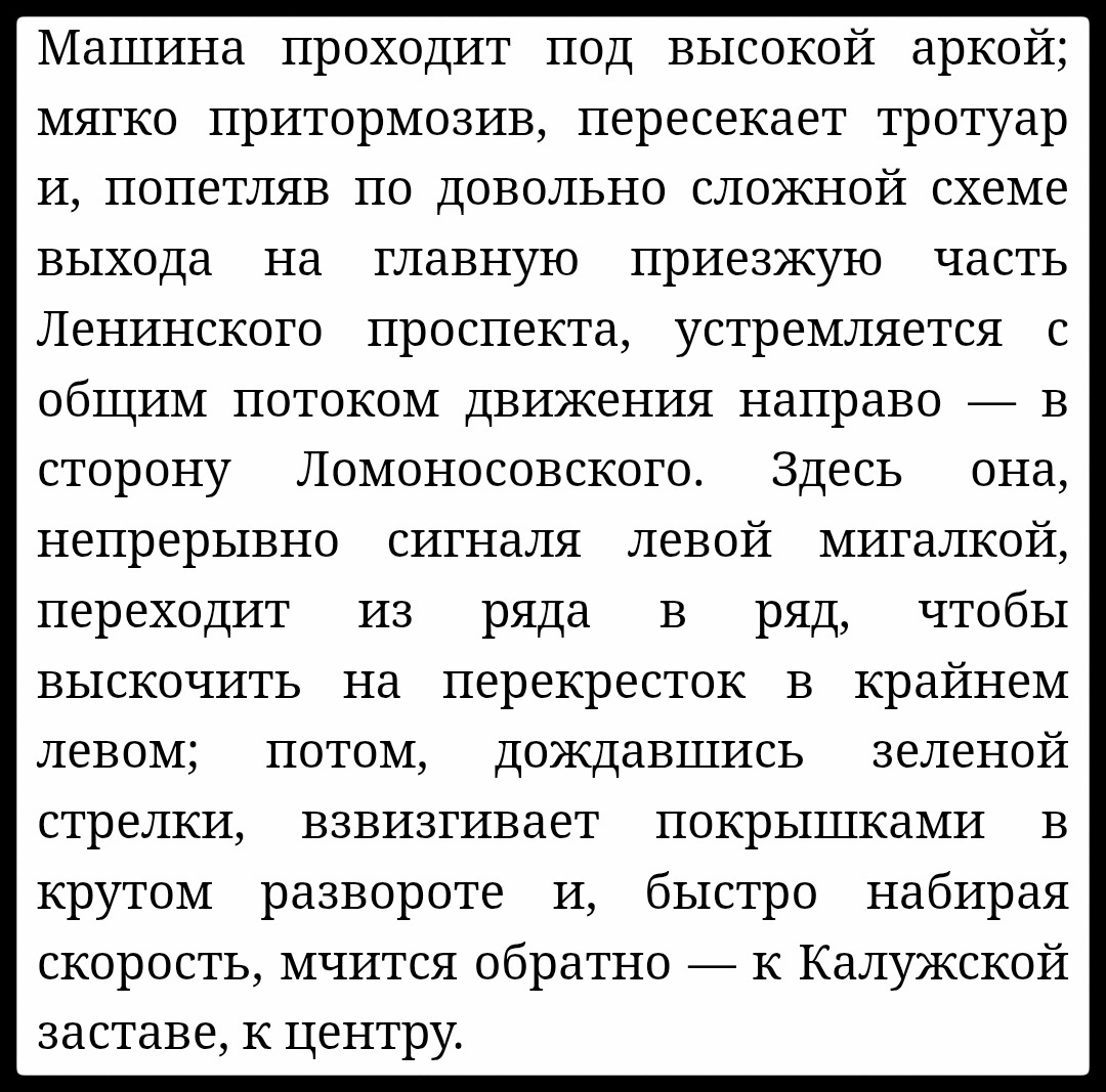 Вот: Иван Афанасьевич передвигается в городе примерно так же, как это делаем мы. Это не та доступная большинству тогдашних граждан поездка на автобусе-троллейбусе, когда присоединяешься к построенному не тобой маршруту, смотришь на неспешно проплывающие сбоку дома, вглядываешься в детали. Это самостоятельно выстроенные маршруты; взгляд вперёд, замечающий лишь крупные объекты-ориентиры; охват больших пространств — глазами, мышлением и скоростью.