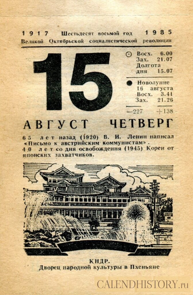 Итак, сегодня 15-го августа и у нас на календаре 1985-й год. Перед нами листок советского календаря для женщин. На календаре у нас четверг - 15 августа 1985-го года. 65 лет назад (1920) В.И. Ленин написал «Письмо к австрийским коммунистам». 40 лет со дня освобождения (1945) Кореи от японских захватчиков. КНДР. Дворец народной культуры в Пхеньяне *** Оборотную сторону листка этого календаря можно посмотреть у нас по ссылке на сайте. Другие листки советских календарей смотрите у нас на сайте - CALENDHISTORY.ru ПОСМОТРИТЕ ЕЩЁ ЛИСТКИ ОТРЫВНЫХ КАЛЕНДАРЕЙ: