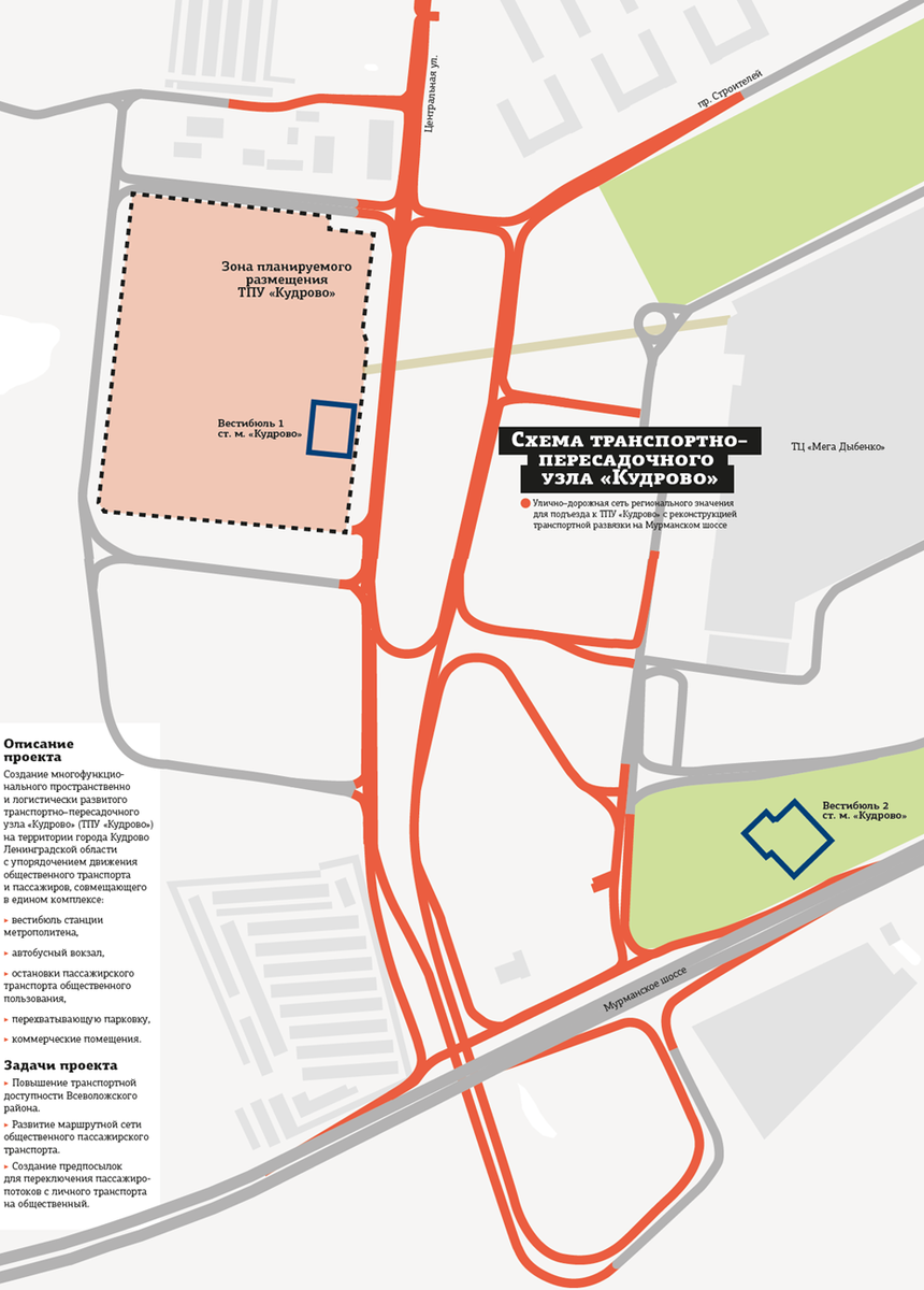 Власти Ленобласти на днях показали схему дорог вокруг будущего ТПУ в Кудрово. Проект подразумевает спрямление Центральной улицы с выходом на Мурманское шоссе, расширение проспекта Строителей, строительство дополнительных проездов и дорог.