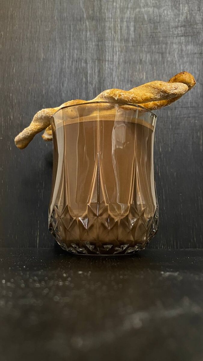 - Прогреть напиток паровиком до 85°, перелить в стакан для подачи, подавать с палочками из слоеного теста.