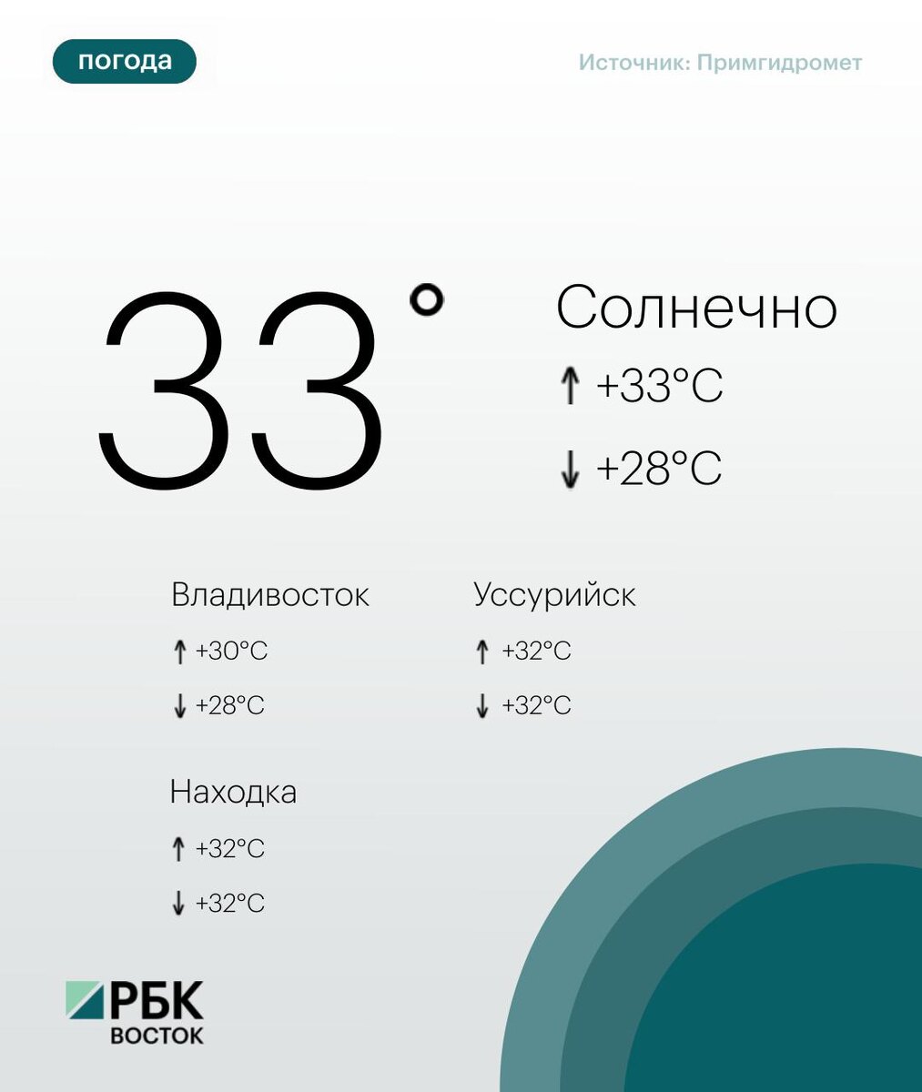 Сегодня погоду в Приморье определяет поле повышенного атмосферного давления. Днём без осадков, утром местами туман. Ветер западный, юго-западный умеренный. Температура воздуха +28...+33°C ☀️ Во Владивостоке переменная облачность, без осадков. Ветер юго-западный, южный умеренный. Температура воздуха +28...+30°C. 😃Подписывайтесь на РБК Восток