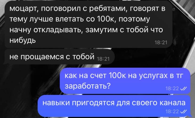Если вы работаете по моей стратегии, то знаете, что вместо затрат можно зарабатывать без вложений. Но не все так просто, потому что работа предстоит большая … Так с какой суммы можно начать зарабатывать в тг? 0₽ Как же так получается? Да все просто, сейчас даже у меня нет активных каналов, которые приносят доход, но есть множество профессий, где без вложений можно получить первую прибыль: - Менеджер по рекламе - Закупщик - Контентщик - Креотивщик - Рассыльщик - Админ чужого канала - Скамщик (жди докс и спортиков) Есть еще сотни вариантов, но многие требуют хоть какого то бюджета, о них возможно позже поговорим. Все эти профессии я испытывал на себе и новичкам рекомендую начинать с менеджера или контентщика. Но так как менеджеры это бичи телеграма, то контент и рассылки дадут тебе первые деньги, опыт, понимание как устроен рынок, связи, медийность. Это услуги, поэтому ваш заработок напрямую зависит от кол-ва сделанной работы. Зп новичка от 0-100к, профи 100к-300к. У