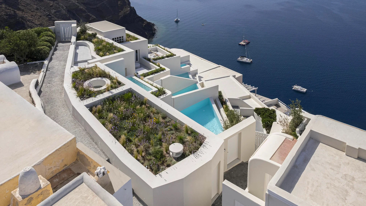 Кубические пещеры на склоне у Эгейского моря — не просто ландшафт, а греческая релакс-сказка на острове Санторини. Белоснежный отель от студии Kapsimalis Architects с пятью мини-виллами расположился на сложном по форме участке, что не помешало создать место для комфортного отдыха. Комплекс состоит из четырёх одноэтажных вилл и одной двухэтажной, у каждого номера есть своя терраса и персональный панорамный бассейн. Перегородки между виллами не только формируют архитектурный ансамбль, но и обеспечивают гостей приватностью. Кубические призмы комнат формировались неспроста: у комнат определённые пропорции, благодаря чему создаётся ощущение плавности и идеальный микроклимат, в котором прохладно и без кондиционера. Минималистическая архитектура, а также микс бежевой штукатурки, тёмного дуба и мрамора дополняют «пещерность» зданий: в них спокойно, уединённо и комфортно. А керамические горшки, ткани с разными фактурами и светильники из опалового стекла наполняют интерьер игривой эклектичностью