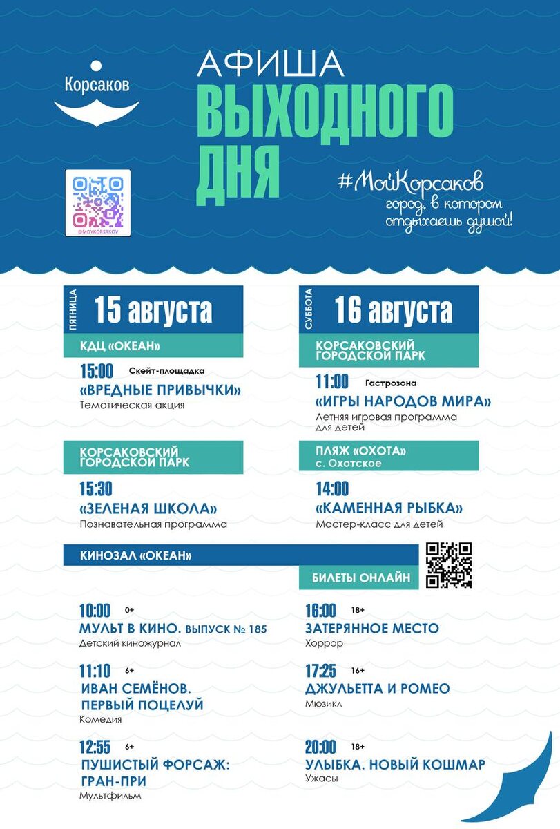 🅰️🅰️🅰️🅰️🅰️🅰️🅰️🅰️🅰️🅰️❗️ Специально для вас мы подготовили насыщенную программу на выходные – выбирайте то, что по душе! ⚫️ Хотите отлично провести время в парке? – Ждём вас на познавательной акции "Зелёная школа" и летней игровой программе "Игры народов мира"! Узнаете много нового о природе, поиграете в забавы разных стран, а ещё – море веселья! ⚫️ Любите полезные знания? – Приходите на акцию "Вредные привычки" в КДЦ "Океан"! Разберёмся, как быть здоровым без скучных лекций. ⚫️ Хотите раскрыть творческие способности? – На пляже в селе Охотское пройдёт мастер-класс "Каменная рыбка"! ⚫️ Киноманы, это ваш выход! – В кинотеатре вас ждёт отличная подборка: добрые мультфильмы для детей, смешные комедии, зажигательные мюзиклы и остросюжетные ужасы для любителей пощекотать нервы. Где бы вы ни были – пусть выходные будут яркими!