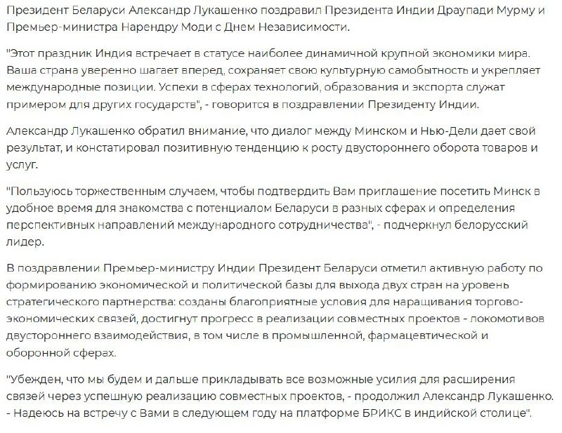 Лукашенко рассчитывает на встречу с Моди в Нью-Дели Президент Беларуси поздравил президента Индии Драупади Мурму и премьера Нарендру Моди с Днем Независимости. @SPUTNIKBY