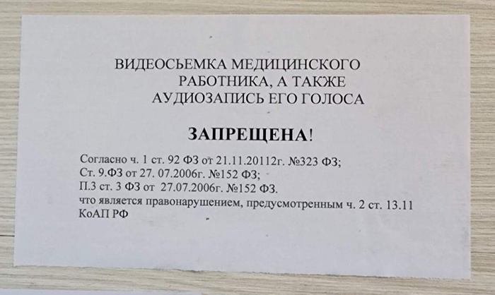 У врача на двери ещё вот эта табличка была изнутри. После финта, который он мне выдал ещё на первом приёме, я её сразу сфоткал. Дома проверил все эти законы. Ни один из них не запрещает вести видео- или аудиозапись во время своего приёма. Иногда врач говорит и пишет разное. Обычно это не противоречит друг другу, а скорее дополняет. В любом случае в разговоре всегда больше информации и подробностей. Всякие там рассуждения, предположения и варианты действий. Меня аудиозапись несколько раз выручала. С юридической точки зрения запись не запрещена, чтобы использовать в личных целях. Вот с публикацией там всё сложнее. Но это вообще отдельный разговор. Я помню, раньше в магазинах вешали таблички, что съёмка запрещена. Потом все узнали, что это блеф. Какие-то магазы даже повесили табличку, что съёмка разрешена, будто они такие добренькие, а не закон. =) Короче, чтобы ничего не запоминать и не записывать ручками прямо во время приёма, можно просто включить диктофон. Вот такая полезная привычка.