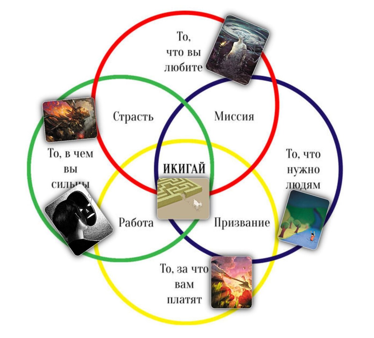 Я нашла свой икигай — и вот как это выглядит Для начала поясню простыми словами: икигай - это японская методика поиска своего дела жизни. Она соединяет четыре важные вещи: 1) Что ты любишь делать 2) В чем ты действительно силён 3) Что нужно другим людям 4) За что готовы платить Когда эти четыре круга пересекаются - вот он, твой икигай, то самое дело, которое наполняет жизнь смыслом. А теперь — как это выглядит у меня (я разобрала себя с МАК картами и получила ясное понимание): То что я люблю: Меня будоражит всё скрытое и тайное. Конспирология, альтернативная история, заговоры - моя страсть. Когда я погружаюсь в эти глубины, чувствую настоящий трепет будто разгадываю вселенский ребус, который большинство даже не замечает. То, что у меня получается лучше всего, моя сила Я вижу, как люди заперты в клетках своих же убеждений. "Я неудачник", "У меня не получится", "Я хорошая девочка" - эти роли прилипли к ним как вторая кожа. Я умею аккуратно снимать эти маски, находя под ними настояще