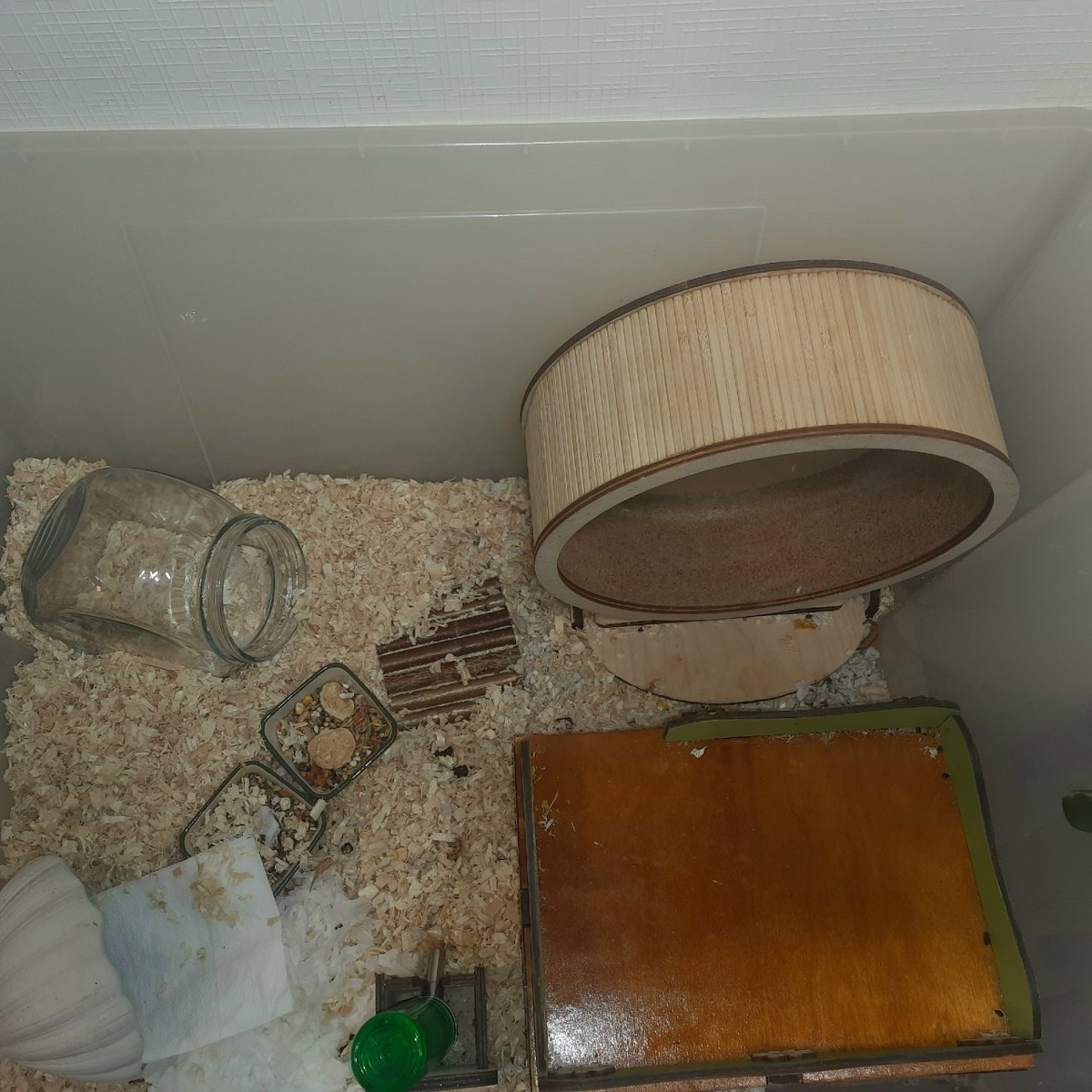 #БГ_Балашиха . Кучино. Продам контейнер самла 130 л, со всем содержимым - дом, колесо 28см, поилки и подставка под поилку, мисочки, 2 керамических домика, банка для песочницы. Остатки .бумажного наполнителя и лиственных опилок. Мебель местами погрызена, колесо отличное, бесшумное. Самовывоз или вы можете сами заказать курьера, отправлю, с предоплатой. https://vk.com/video-170960737_456239174