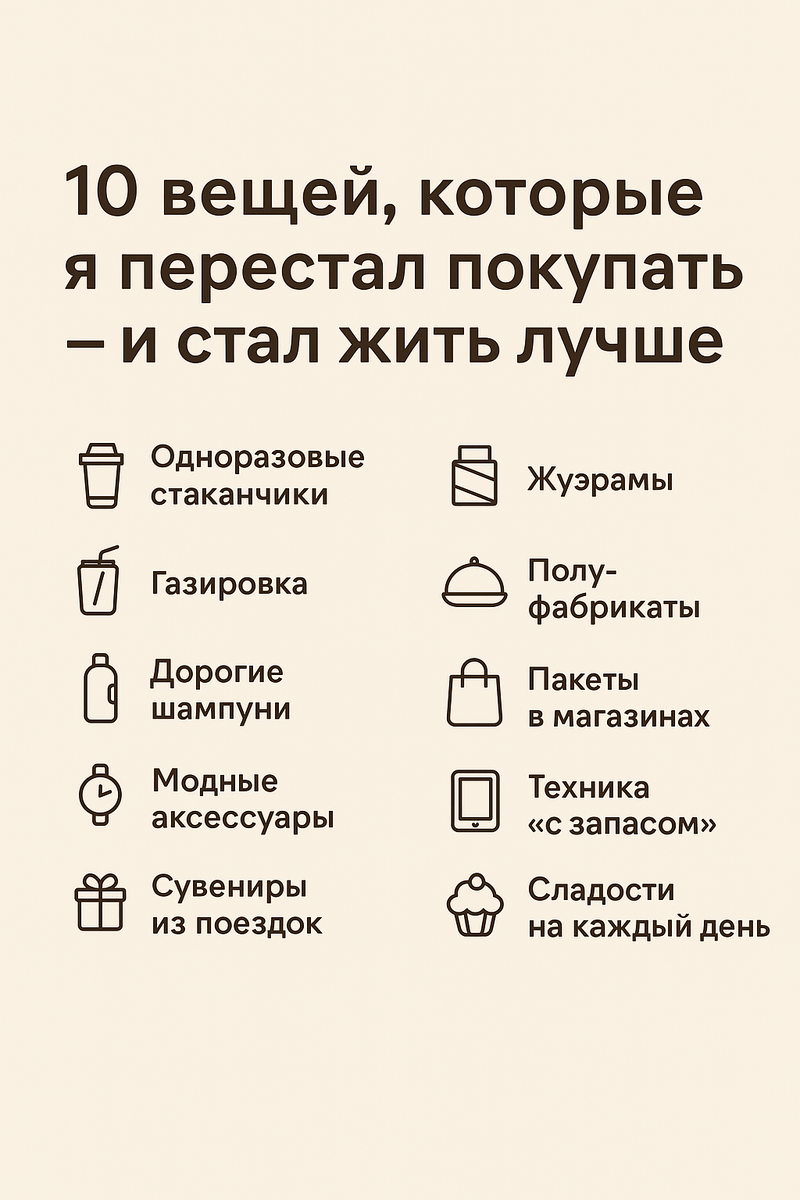 Иногда отказаться от чего-то полезнее, чем искать способы сэкономить. Вот список того, что я убрал из своей жизни, и совсем не жалею. Перешёл на многоразовую термокружку — экономлю и на кофе, и на экологии. Меньше сахара — лучше здоровье и меньше чек в магазине. Оказалось, что обычный аптечный вариант работает даже лучше. Тренды меняются быстро, а базовые вещи служат годами. Фотографии и впечатления — лучшая память. Всё есть онлайн и бесплатно. Готовлю сам — вкуснее и дешевле. Хожу с многоразовой сумкой. Не беру лишние функции, которые потом не использую. Оставил только редкие «праздничные» случаи — и для здоровья, и для кошелька плюс. 💬 Иногда лучший способ экономить — просто перестать покупать лишнее. 📌 Подписывайся на канал — скоро расскажу, на какие вещи стоит потратиться даже при ограниченном бюджете.