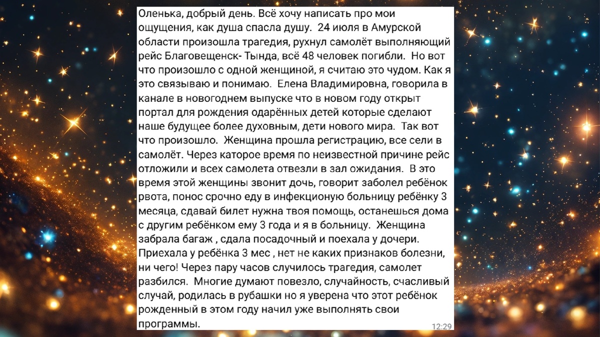 Вот такое сообщение пришло нам почти сразу после новостей о крушении пассажирского Ан-24 24 июля: Приветствую вас, дорогие читатели! На связи Елена Владимировна. «Родился в рубашке», «Бог отвёл», «Ангел-хранитель есть» – это всё о том, для чего и почему приходят на Землю разные души, почему случаются «чудеса» с людьми, почему про это даже снимают фильмы и пишут книги. Повезло по счастливой случайности – говорят лишь скептики. На самом деле, если посмотреть глубже, это тот самый знак, это тот самый ангел-хранитель, это тот самый духовный наставник, который и предотвратил беду. Это значит, что женщине ещё рано было уходить, её душа ещё не успела выполнить своего предназначения на Земле. Слово «предназначение» может звучать как-то очень громко, а ведь это вовсе не обязательно про какое-то геройство, спасение, глобальную цель. Предназначение души может заключаться в каком-то влиянии на свою семью, в выборе пути или профессии, да даже в какой-то одной мимолётной ситуации – милостыню подать,