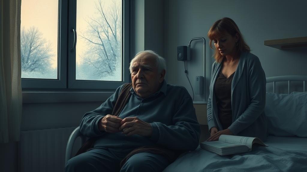 Она толкнула дверь, и та открылась с сухим щелчком. В палате было прохладно, пахло антисептиком и чем-то ещё, резким, больничным. Пётр Николаевич сидел у окна, отвернувшись, будто рассматривал заснеженные ветви за стеклом. Он не повернулся, даже когда дверь закрылась.