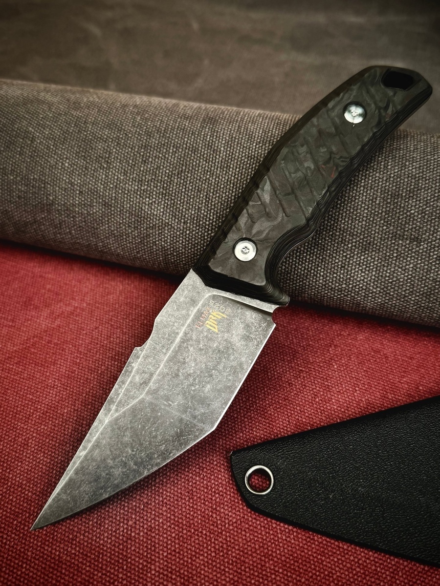 Клинок выполнен из порошковой стали Elmaх, а на эргономичной рукояти накладки из хаотичного карбона.