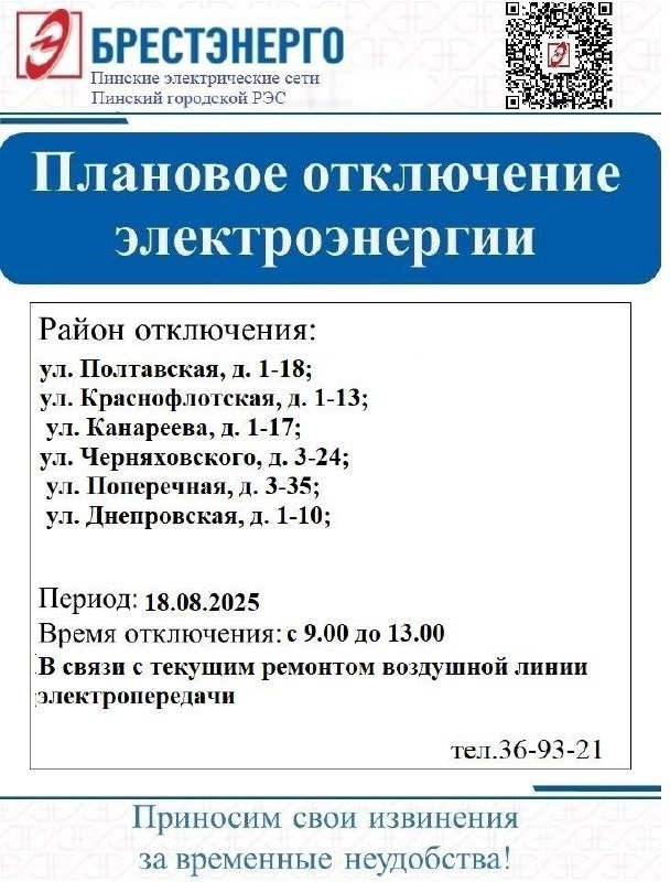 🔺Электросети предупреждают о плановом отключении электроэнергии