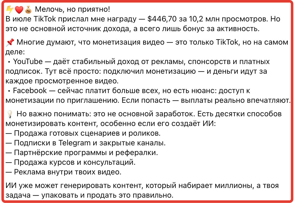 Не совсем про ИТ, но рядом с оным. Цифры дохода от роликов на ТикТоке - 450$ за 10 млн. просмотров. Ну там и детали на картинке, если интересно поизучать еще советы... В России выплаты не работают, учтите.