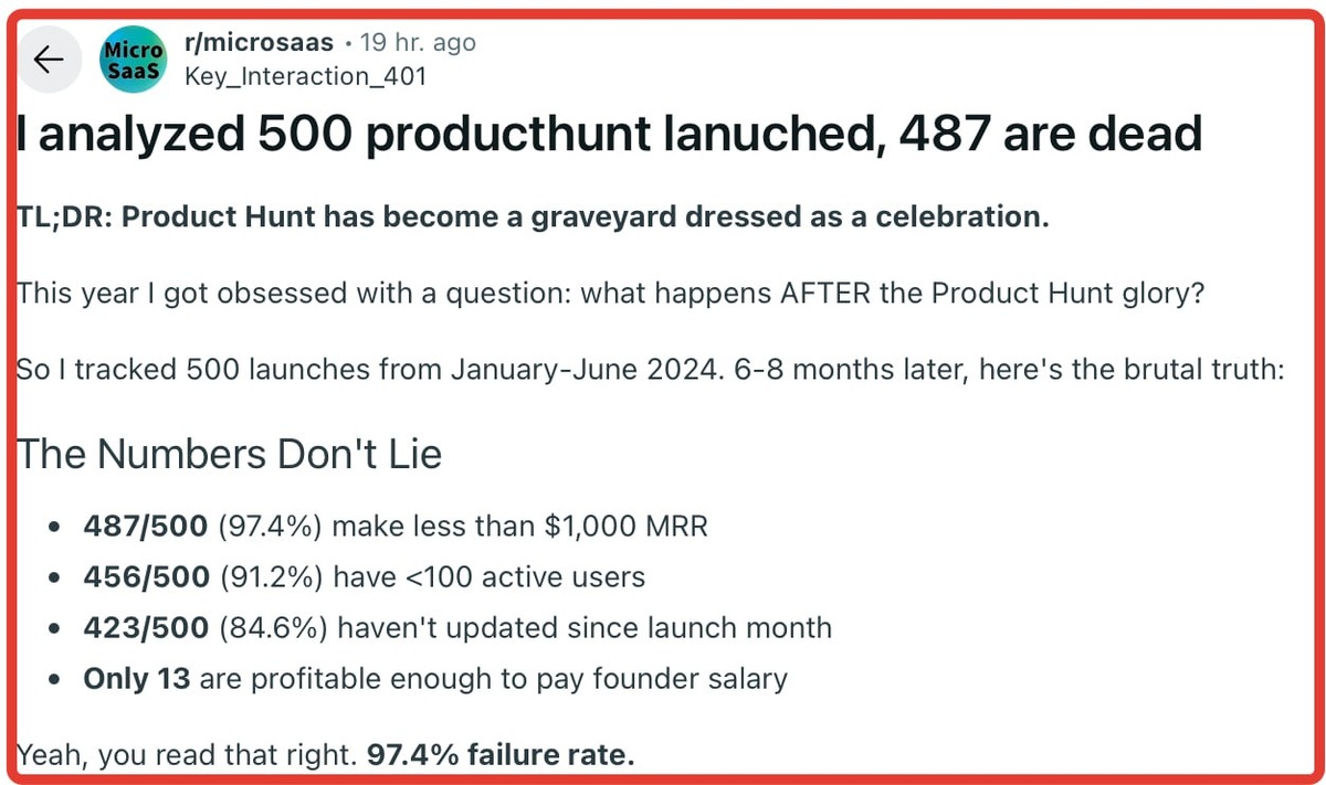 В начале 2024 года чел взял на карандаш 500 запусков на Product Hunt. Через полгода оказалось, что 487 из них зарабатывают меньше тысячи долларов в месяц, 456 имеют меньше сотни активных пользователей, а 423 даже не обновлялись после первого месяца жизни :) Всего 13 проектов способны кормить своих создателей. Процент провала впечатляет - 97,4. Типичный путь неудачника выглядел одинаково: полгода тихой работы в одиночку, один день славы на Product Hunt и резкий переход к поиску клиентов, который заканчивается медленной смертью проекта. Выжившие же действовали иначе - они продавали решение ещё до того, как начали его делать. Один из примеров - 47 человек пообещали платить по 50 долларов в месяц, и это принесло 2 350 долларов гарантированного дохода до написания первой строки кода. Мораль простая и неприятная: Product Hunt вознаграждает шумом, а не клиентами :). Апвоуты льстят, но счет в банке от них не растёт. Если за идею никто не заплатил реальными деньгами, то это не бизнес, а хоб
