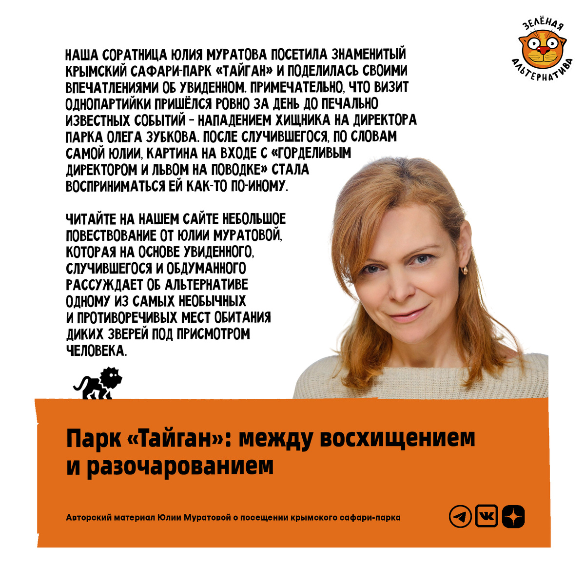 Наша соратница Юлия Муратова посетила знаменитый крымский сафари-парк «Тайган» и поделилась своими впечатлениями об увиденном. Примечательно, что визит однопартийки пришёлся ровно за день до печально известных событий – нападением хищника на директора парка Олега Зубкова. После случившегося, по словам самой Юлии, картина на входе с «горделивым директором и львом на поводке» стала восприниматься ей как-то по-иному. Читайте на нашем сайте небольшое повествование от Юлии Муратовой, которая на основе увиденного, случившегося и обдуманного рассуждает об альтернативе одному из самых необычных и противоречивых мест обитания диких зверей под присмотром человека: https://zaecology.ru/statja/park-tajgan-mezhdu-voshishheniem-i-razocharovaniem/