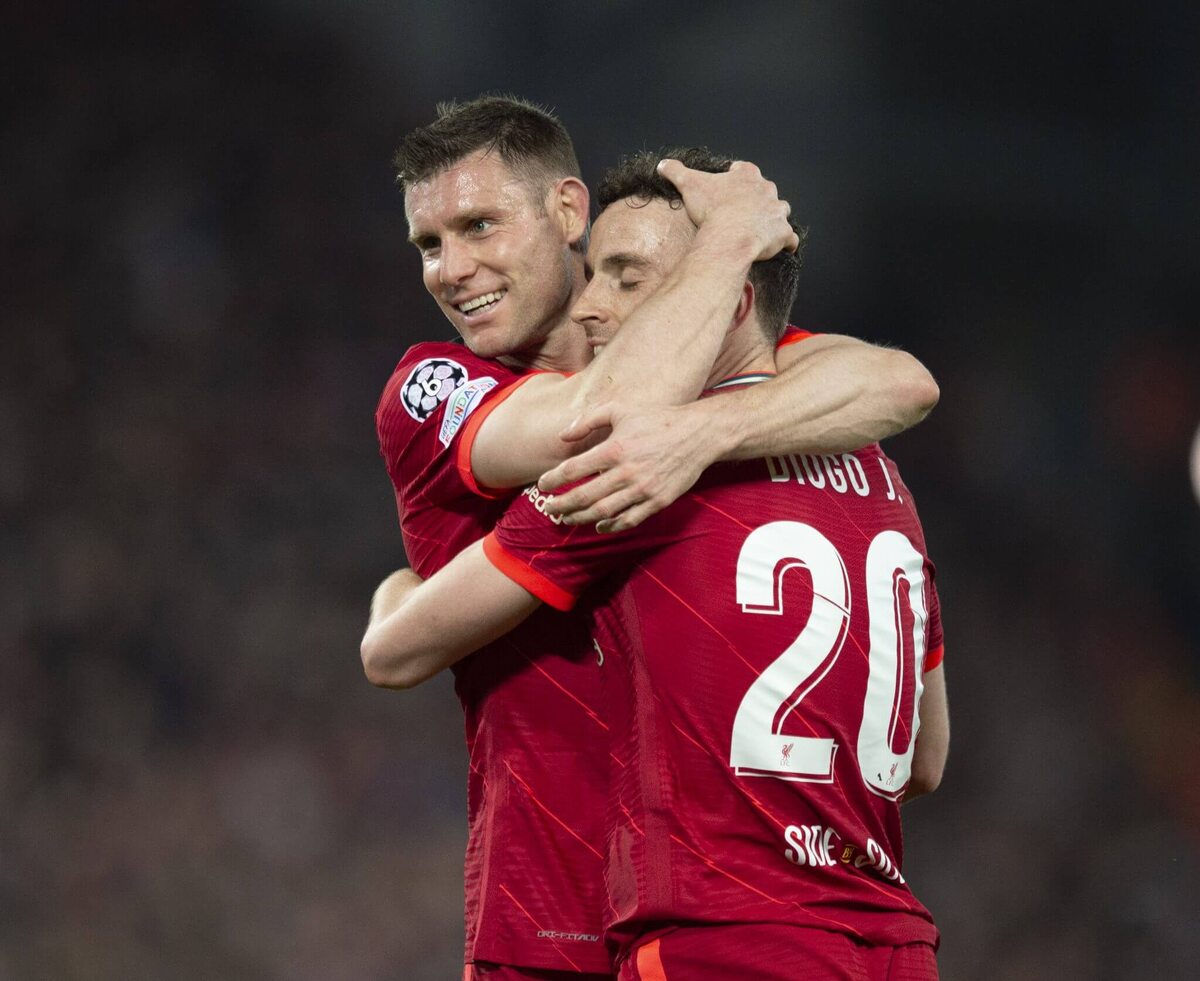 Милнер и Жота празднуют победу «Ливерпуля» в четвертьфинале Лиги чемпионов против «Бенфики» в 2022 году (Джо Прайор/Visionhaus через Getty Images)