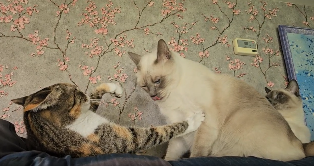 Как говорится - ничто не предвещало. Златик спокойно лежала на лежанке и спала. К ней подобрался Стёпа. Зная, что он любитель "потроллить" Златику, наслаждаясь её скандалом, я строго погрозила Стёпе пальцем и сказала "Нельзя!!!" Стёпа кот умный, он на меня взглянул в хитром недоумении: "Да я и не собирался ничего этакого делать" и улёгся спать рядом со Златой. Минут через 10 прибыл вреднокот (и известный рейдер) Митя, которому конечно же надо было лечь непременно на место Златы. И он начал своё заунывно-противное Мааааааау, что, вероятно, на кошачьем подразумевало огромный перечень угроз, которые конечно же должны были напугать и согнать с места Злату. Но Златка у нас кошка бывалая - не первый год с этими "отморозками" под одной крышей живёт. 😁 Она врубила завывающую сирену и почти схватила Митяя "за грудки". Митя предпринял атакующее движение, но внезапно оказался в меньшинстве, т.к. на него напали сразу двое: спереди и обороняющаяся Злата и со спины его рОдненький дядя кот Стёпа, к