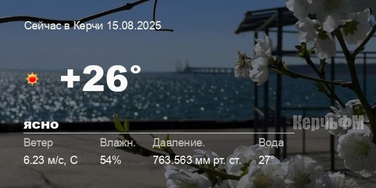 Погода в Керчи 15 августа Сегодня днем в Керчи, 15 августа, ожидается ясная погода, температура воздуха от +21.5° до +25.9°С, ветер северный 6.94 м/с, давление 762.8 мм рт. ст., влажность 55%. Ближайшей ночью ожидается ясная погода, температура +23.7°С. Завтра, 16 августа, в течение суток ожидается ясная погода; ночью +23.7°С, днем +24.8°С, ветер северный 5.83 м/с. - Феодосия от +20.3° до +28.6°С, 🌞 ясно, море: 25°C - Судак от +18.9° до +25.8°С, 🌞 ясно, море: 25°C - Симферополь от +17.7° до +30... подробнее Подписывайся на КерчьФМ.РФ @kerchfm