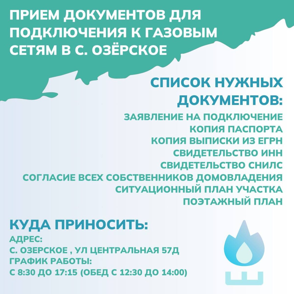 🅰️🅰️🅰️🅰️🅰️🅰️🅰️🅰️❗️ ▶️Сообщаем о начале работ по газификации населенного пункта с. Озерское. Для оформления подключения к газовым сетям необходимо предоставить следующие документы: 💙Заявление на подключение (бланк можно получить в администрации); 💙Копия паспорта (страницы с фотографией и регистрацией); 💙Копия документа, подтверждающего право собственности на дом или земельный участок (свидетельство о госрегистрации, выписка из ЕГРН); 💙ИНН; 💙СНИЛС; 💙Согласие всех собственников домовладения и земельного участка, их паспорта и (или) свидетельство о рождении; 💙Ситуационный план участка (при наличии); 💙Поэтажный план. 📝Документы принимаются в здании администрации по адресу: с. Озерское, ул. Центральная, 57Д, с понедельника по пятницу с 8:30 до 17:15 (перерыв с 12:30 до 14:00). 💚Своевременная подача документов поможет ускорить процесс газификации вашего домовладения. Просим внимательно проверить перечень и подготовить все необходимое заранее.