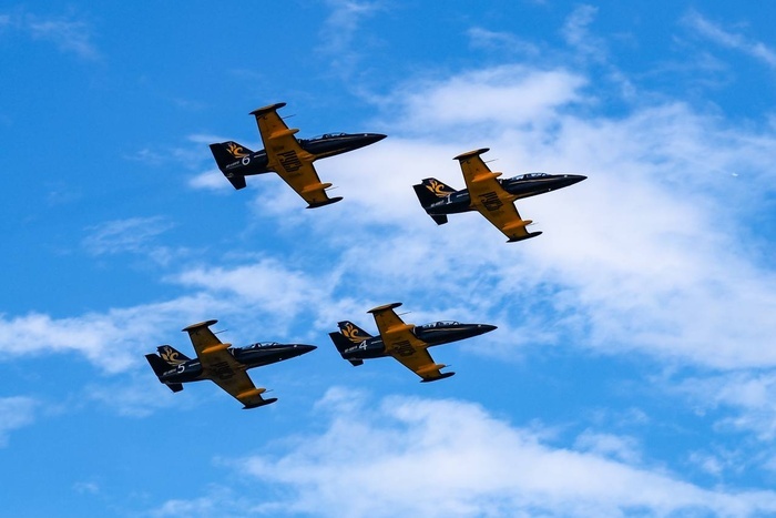 Накануне, 14 августа, в небе над Екатеринбургом пролетели четыре лёгких штурмовика Л-39 «альбатрос» пилотажной группы «Русь». Команда приземлилась в Кольцово. Пилоты выполнят показательное выступление в честь Дня города, который столица Урала отметит в эту субботу, сообщают в пресс-службе Кольцово. На странице пилотажной группы также указано, что лётчики выступят на фестивале «Энергия РМК» 16 августа. Точное время неизвестно, но, вероятнее всего, шоу устроят на открытии фестиваля. Ранее мы публиковали подробную программу Дня города в Екатеринбурге. Смотрите здесь, чтобы ничего не пропустить.