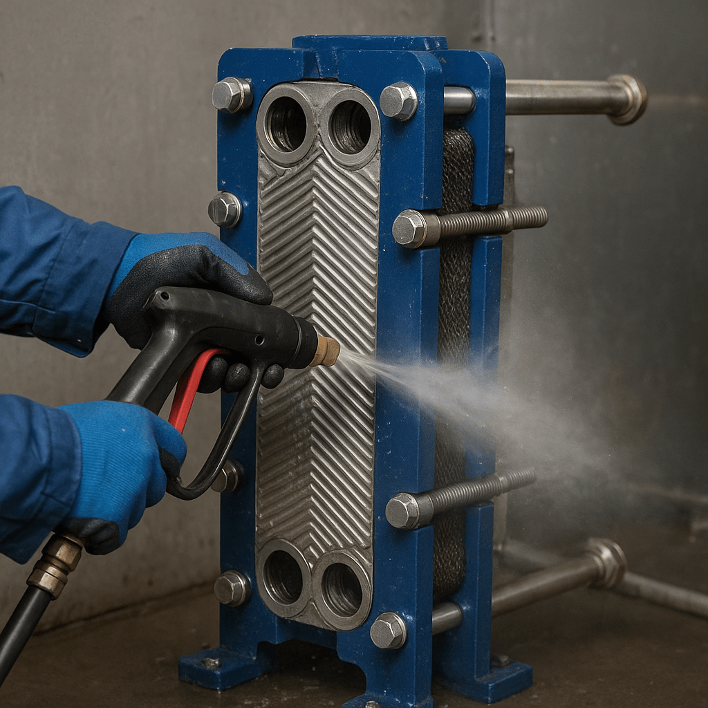 Минусы: не подходит при сильных отложениях. Теплообменник разбирается, каждая пластина очищается вручную или мойкой высокого давления.