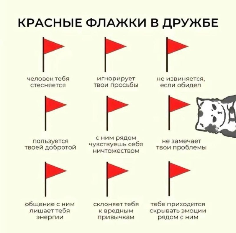 Помогаем ребенку найти хороших друзей Чтобы найти хороших, нужно сначала научиться отличать плохих. Если ребенок 9-12 лет, то можно просто дать ему эту табличку в помощь. Детям помладше лучше помогать, самостоятельно спрашивая наличие этих красных флагов в их дружбе с кем-то.