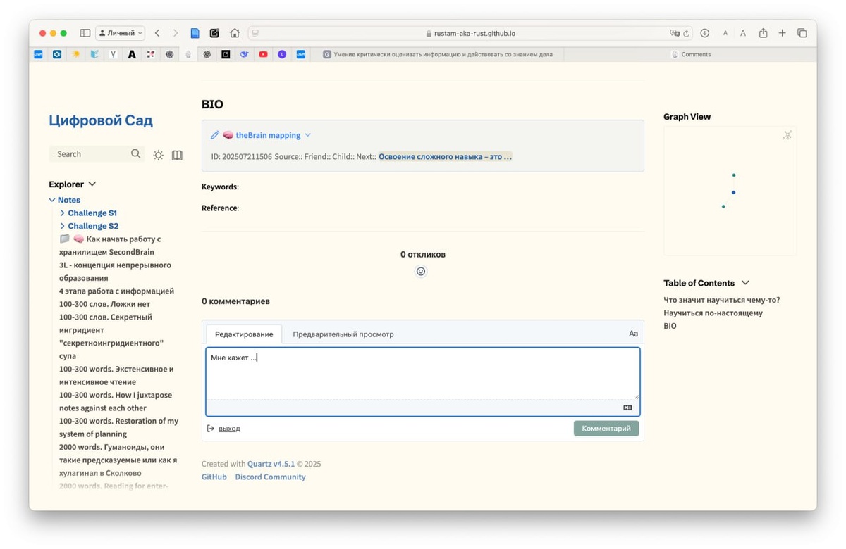 ### Наконец-то… Благодаря Никите, я обновил свой цифровой садик! Теперь у меня там появились комментарии. Это значит, что каждую запись в цифровом садике можно обсуждать и строить целые дискуссии вокруг моих утверждений и убеждений. В общем, приглашаю всех! Ну и, немного об интеллектуальной работе: я начал серию эссе об освоении навыков. Она развивается в неспешном режиме, так как я все-таки в отпуске, много читаю, гуляю и стараюсь ни о чем не думать. – Что значит научиться чему-то? Научиться по-настоящему – Освоение сложного навыка – это … – Значимость действия в контексте освоения навыка – Дихотомия действие – наблюдение в отношении значимого действия Впереди еще уйма работы и масса идей. На удивление, получается очень интересная серия… Приглашаю комментировать прямо в цифровом садике! Как вам функционал комментариев? Поделитесь своими мыслями. П.С. Сначала я решил обновить свой садик самостоятельно, но где-то накосячил и продолбал какие-то записи, поэтому, если чего-то не хв