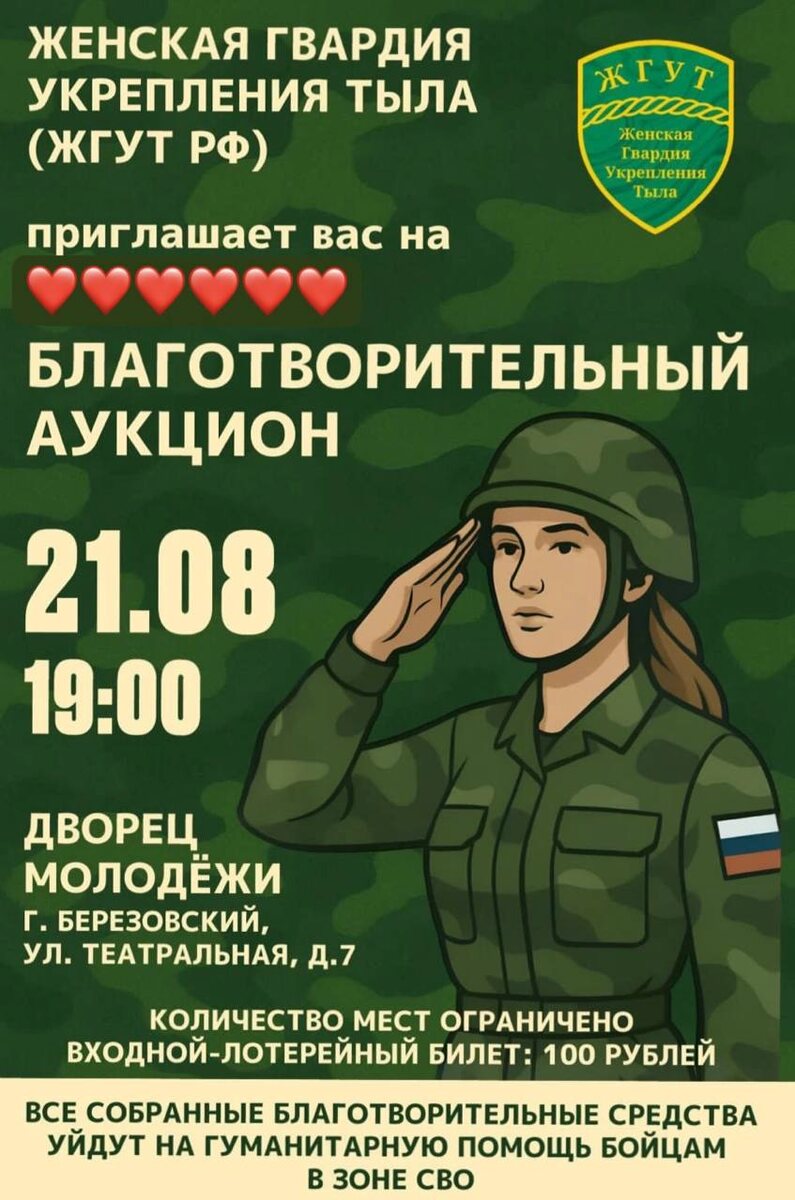Приглашаем всех желающих на благотворительный аукцион ЖГУТ РФ. Мероприятие состоится 21 августа в 19:00 во Дворце молодежи (г.Березовский, ул.Театральная, 7, 2 этаж) Это вечер, где каждый гость сможет не только насладиться атмосферой элегантности и живой музыки, но и внести личный вклад в гуманитарную помощь бойцам, находящимся в зоне СВО. 📍Вас ждёт коллекция уникальных лотов - от авторских картин до изделий ручной работы. Все средства, вырученные с продаж, будут направлены на поддержку наших защитников, в то время как приобретённые лоты останутся в вашем распоряжении. 🤵🏼♀️Мероприятие проходит в вечернем дресс-коде, в сопровождении музыкально-развлекательных пауз. ⚜️ Участие возможно только по предварительной регистрации - приобретению входного-благотворительного билета стоимостью 100 ₽. Билет включает: — персональное место — бокал игристого и фруктовое угощение — индивидуальную табличку для участия в аукционе — автоматическое участие в розыгрыше трёх призов ❗Количество