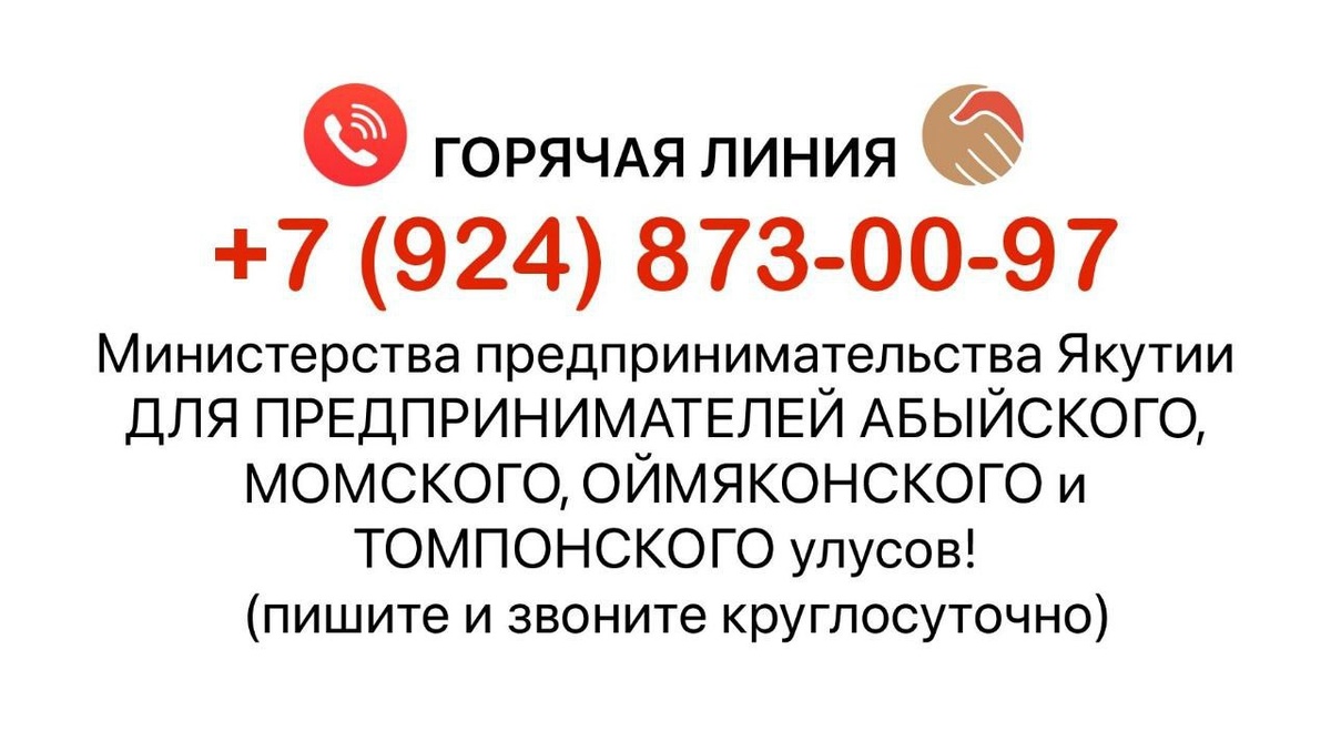 ❗️❗️❗️Напоминаем, работает «ГОРЯЧАЯ ЛИНИЯ» Министерства предпринимательства РС(Я) для предпринимателей Абыйского, Момского, Оймяконского и Томпонского улусов. ☎️По вопросам ущерба, понесенного предпринимателями во время ЧС, в части ведения предпринимательской деятельности, пишите и звоните по номеру: +7 (924) 873-00-97 ✔️«ГОРЯЧАЯ ЛИНИЯ» работает КРУГЛОСУТОЧНО! @moibizsakha