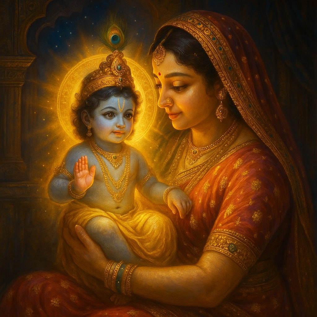 🌈 Произошло чудо: стражи уснули, замки и цепи спали, а Васудева, ведомый светом, вышел в ночь. Река Ямуна расступилась 🌊, открывая путь. Он отнёс Кришну в дом пастуха Нанды и его жены Яшоды во Вриндаване. Там Кришна рос в любви и заботе 💛. И хотя биологической матерью была Деваки, весь мир помнит безусловную материнскую любовь Яшоды.