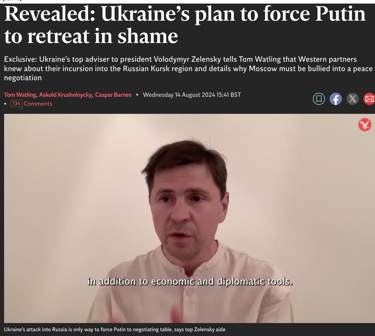 - Украинские власти «не на публичном уровне» обсуждали операцию ВСУ в Курской области с западными партнерами, заявил в интервью The Independent советник главы офиса президента Украины Михаил Подоляк. Как отмечает газета, ключевые западные союзники Украины, включая Великобританию и США, ранее опровергли, что были проинформированы о наступлении ВСУ. Однако Подоляк с этим не согласился.