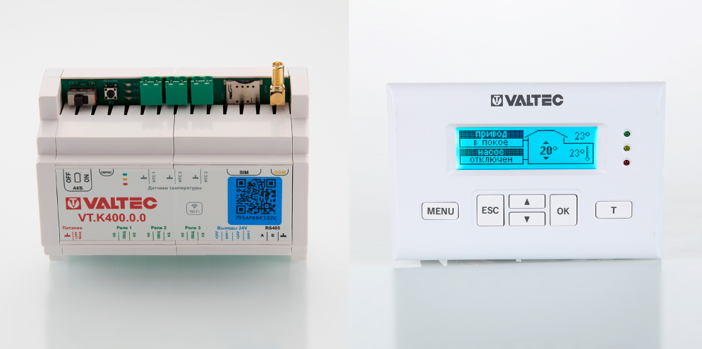 17 июля VALTEC анонсировал выход новинки в разделе автоматики. Универсального контроллера для смесительных узлов – VT.K400. Новый контроллер является усовершенствованной заменой предыдущей версии VT.K300 c более широким функционалом и возможностью настройки системы индивидуально под пользователя. Для начала давайте ознакомимся с возможностями нового контроллера. Его основное назначение- это плавное управление насосно-смесительными узлами (НСУ) как заводского производства (VT.COMBI, VT.VALMIX, VT.TECHNOMIX) так и узлами изготовленными на базе трехходовых клапанов нажимного типа (VT.MR01, VT.MR02, VT.MR03) и ротационного (VT.MIX03, VT.MIX04). Для этого на борту контроллера имеется два 24В выхода для управления нажимными электротермическими сервоприводами и три релейных выхода типа сухой контакт. Причем в случае с управлением НСУ на базе нажимных клапанов к контроллеру может быть подключено два НСУ (с ротационным клапаном только один). На всякий случай для ясности. Для подключения нажимн