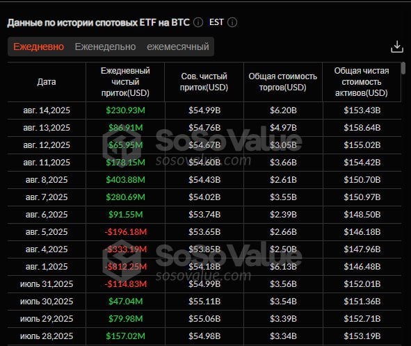 πΈ14 Π°Π²Π³ΡΡΡΠ° ΡΠΏΠΎΡΠΎΠ²ΡΠ΅ Π±ΠΈΡΠΊΠΎΠΈΠ½-ETF Π² Π‘Π¨Π Π·Π°ΡΠΈΠΊΡΠΈΡΠΎΠ²Π°Π»ΠΈ ΡΠΈΡΡΡΠΉ ΠΏΡΠΈΡΠΎΠΊ Π² ΡΠ°Π·ΠΌΠ΅ΡΠ΅ $231 ΠΌΠ»Π½. Π‘ΠΏΠΎΡΠΎΠ²ΡΠ΅ ETF Π½Π° Ethereum Π·Π°ΡΠΈΠΊΡΠΈΡΠΎΠ²Π°Π»ΠΈ ΡΠΈΡΡΡΠΉ ΠΏΡΠΈΡΠΎΠΊ Π² ΡΠ°Π·ΠΌΠ΅ΡΠ΅ $640 ΠΌΠ»Π½.