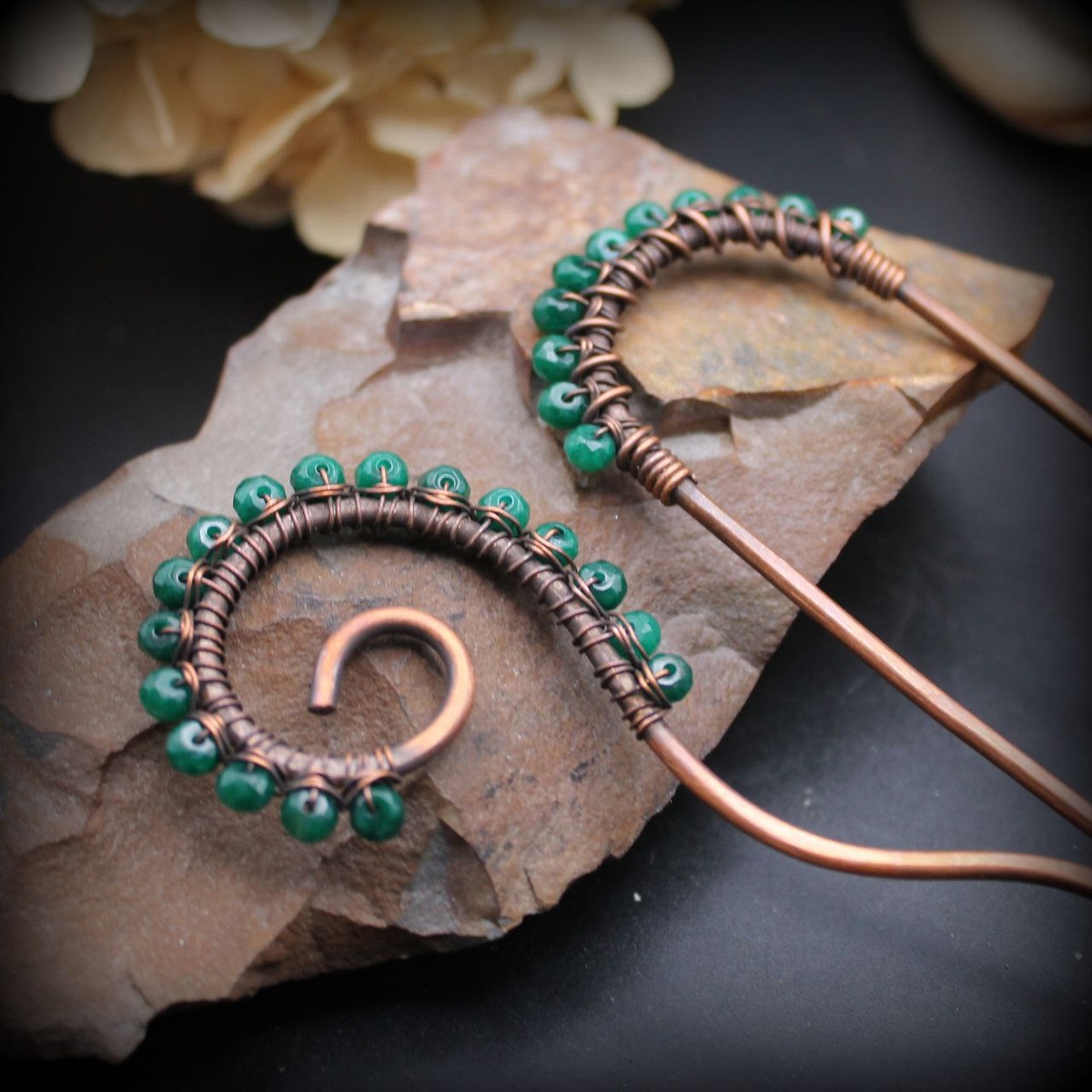 Комплект медных шпилек с зелёным агатом. Пара медных шпилек с агатом темно-зелёного цвета. Шпильки двух видов - шпилька с двумя зубцами, длиной 12 см, и шпилька изогнутая классическая, длиной 16 см. Шпильки лёгкие, прочные и надежно держат волосы. Плотные жесткие шпильки для закалывания волос. Сделаны из прокованной меди и агата. Медь покрыта патиной и отшлифована. Не цепляют волосы, не царапают кожу, хорошо держат прическу. #медныесказки #ручнаяработа #шпилькидляволос #заколки #медныешпильки #комплектшпилек #агат