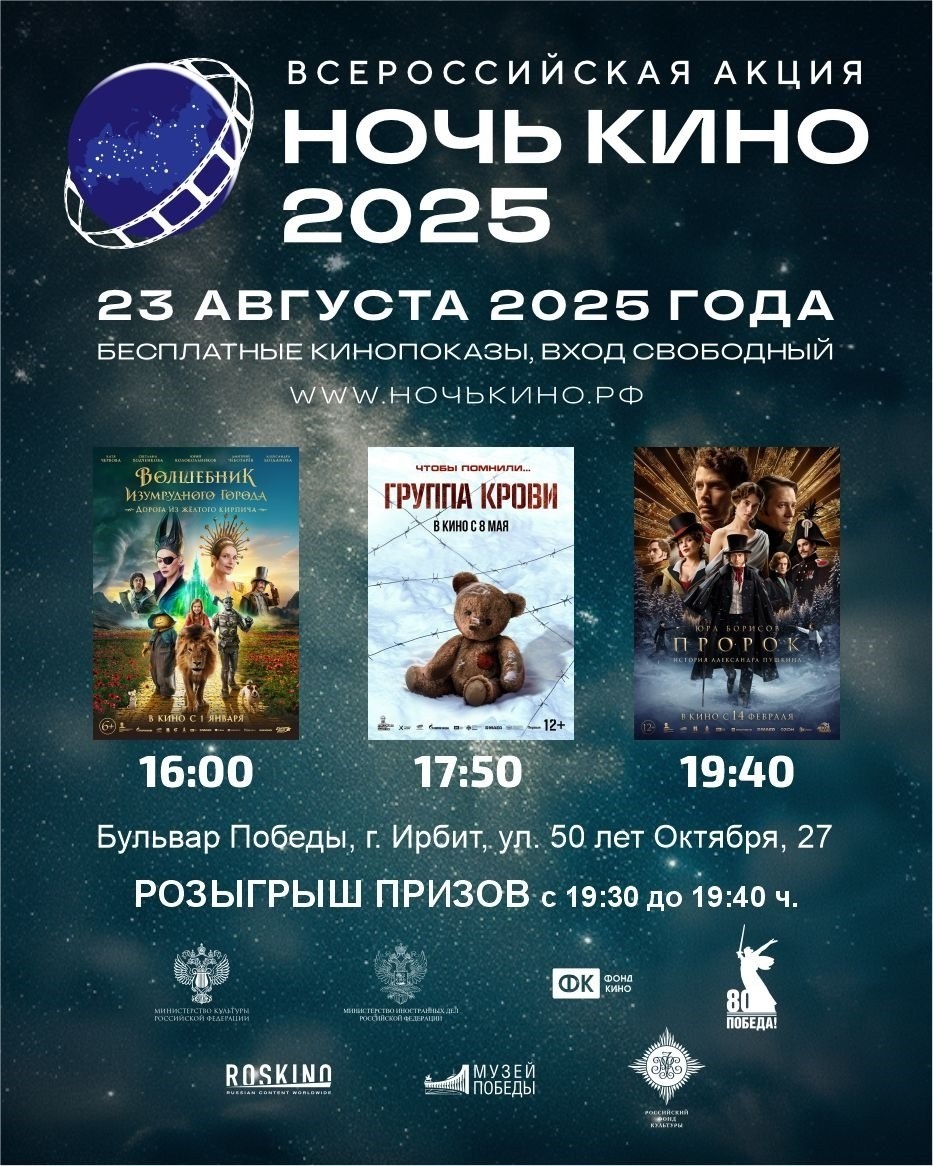 Впервые в Ирбите — «Ночь кино 2025» под открытым небом! 📅 дата: 23 августа в 16:00 📌 место: Бульвар Победы, ул. 50 лет Октября, 27 🎥 Программа: ✅ 16:00 — семейное фэнтези «Волшебник Изумрудного города. Дорога из жёлтого кирпича» (6+), реж. Игорь Волошин ✅ 17:50 — военная драма «Группа крови» (12+), реж. Максим Бриус ✅ 19:40 — музыкальный байопик «Пророк. История Александра Пушкина» (12+), реж. Феликс Умаров 🎰 19:30 - розыгрыш призов 🎁 На все сеансы вход свободный❗ 🌟 Не упустите возможность насладиться любимыми фильмами под открытым небом! Приходите всей семьей и друзьями! 👫Возьмите с собой термос с вкусным чаем, плед на случай холодной погоды, зонт или дождевик на случай дождя, а также можно захватить раскладной стульчик, чтобы расположиться своей компанией и насладиться просмотром в комфортной обстановке🎬👨👨👧👧