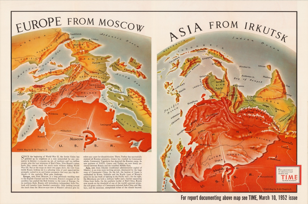 25 августа 1952 года в американском журнале “Time” была опубликована пара карт Роберта М. Чапина-младшего “Европа из Москвы”, “Азия из Иркутска”. Решалась пропагандистская задача представить СССР угрозой для Европы и Азии. Картограф для создания особого зрительного ощущения использовал проекции и цветовые решения (с переходом от тёмных цветов к светлым), чтобы зрителю казалось: советская армия может буквально скатиться в самый центр маленькой Европы. Выбранная перспектива даёт такое искажение расстояний, что расстояние от Парижа до Лиссабона на этой карте кажется примерно таким же, как расстояние от Москвы до Ленинграда. Текст ещё больше сгущал краски: