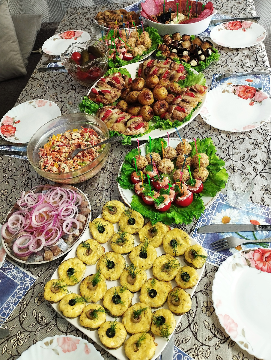 Накануне вечером я замариновала (сделав надрезы) куриное филе для горячего блюда и отварила креветки и кальмары, необходимые мне для закусок. А, да, отварила ещё пару картофелин "в мундире" для подачи с селëдочкой и вкуснейшим маринованным луком. Остальное всё готовилось в тот самый день с утра. Так как гости были приглашены к 17 часам вечера, то я спокойно всё успела. Правда, чтобы не было полнейшей хаотичности, я всё же заранее составила на бумаге список поочерёдного приготовления закусок, горячего блюда и салата (кстати, впервые в жизни у нас на праздничном столе был всего лишь один салат, остальное - закуски!). 1. Салат с копчëной куриной грудкой и тремя видами болгарского перца. 2. Рулетики из баклажанов (в этот раз делала с обычными плавлеными сырками + чеснок). 3. Шампиньоны, обжаренные в муке на сковороде. 4. Кабачки с нежной сырной шапочкой, запечëнные в духовке. 5. Помидоры, фаршированные креветками и сливочным сыром. 6. "Рафаэлло" из кальмаров. 7. Селëдочка с