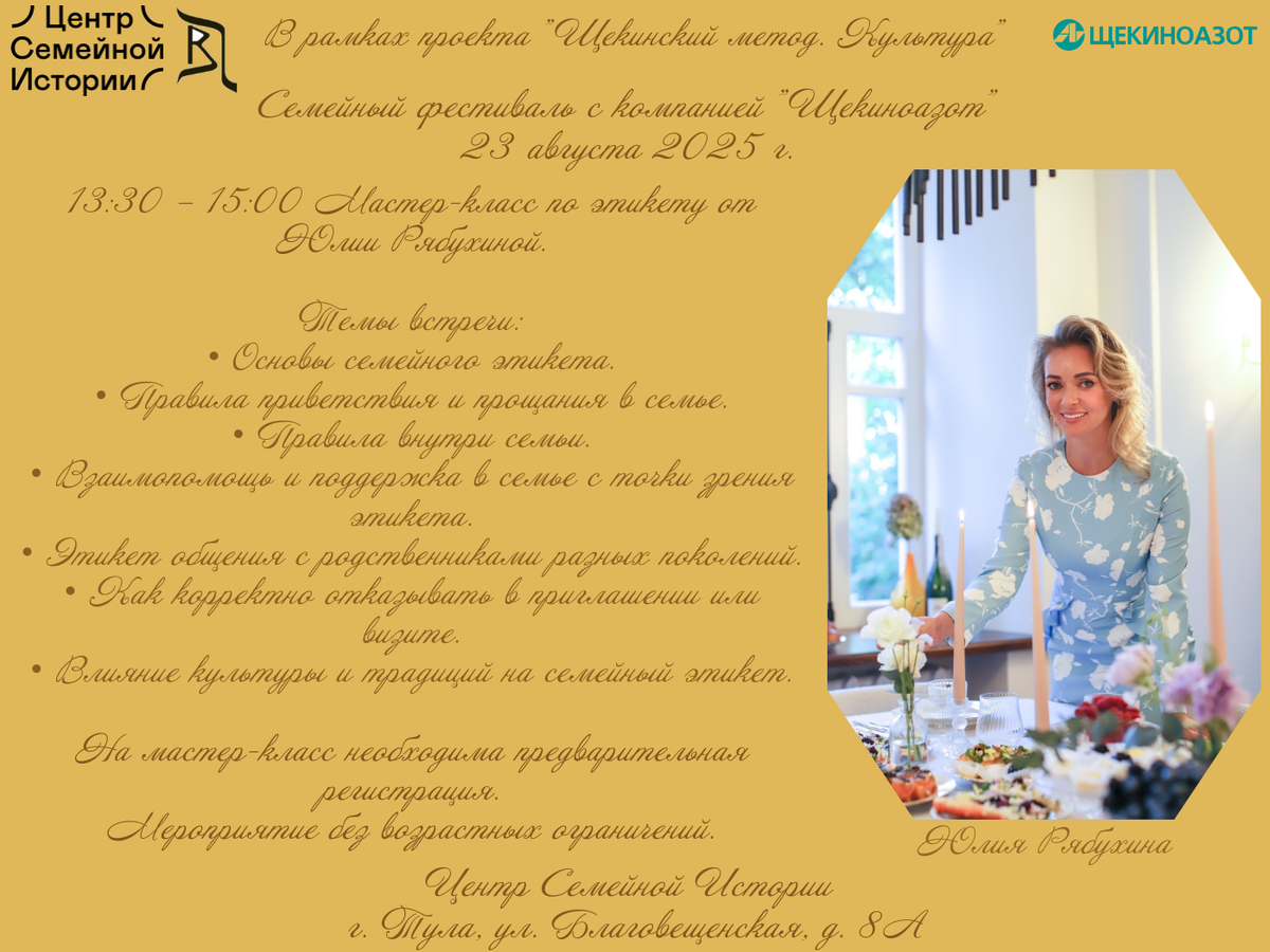 Продолжаем рассказывать о программе семейного фестиваля со «Щекиноазотом». Встречу с Юлией Рябухиной можно назвать традиционной, ведь в этом году состоялось уже два мероприятия по этикету для сотрудников компании «Щекиноазот» и членов их семей. 23 августа с 13:30 до 15:00 вновь пройдет мастер-класс по этикету. В этот раз – особое внимание семейному этикету и русской культуре. Темы встречи: ∙ Основы семейного этикета: уважение и взаимопонимание. ∙ Правила приветствия и прощания в семье. ∙ Правила внутри семьи: личные вещи, личное пространство, чужой телефон/переписка, секреты семьи. ∙ Взаимопомощь и поддержка в семье с точки зрения этикета. ∙ Этикет общения с родственниками разных поколений. ∙ Как корректно отказывать в приглашении или визите. Ответ. Отказ. Правило двух отказов. Запреты. ∙ Влияние культуры и традиций на семейный этикет. Возрастных ограничений для встречи нет. Юлия расскажет о семейном этикете так, чтобы было понятно и взрослым, и детям. Для посещения мастер-класса по эт