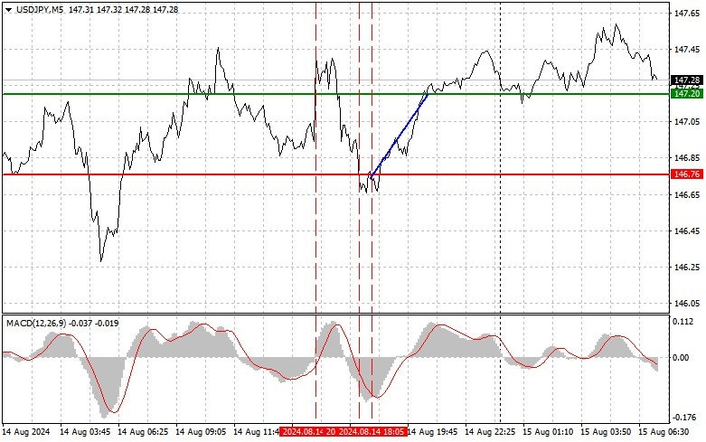 Тест цены 146.84 пришелся на момент, когда индикатор MACD только начинал движение вверх от нулевой отметки, что стало подтверждением правильной точки входа на покупку доллара и вылилось в рост пары более чем на 60 пунктов.