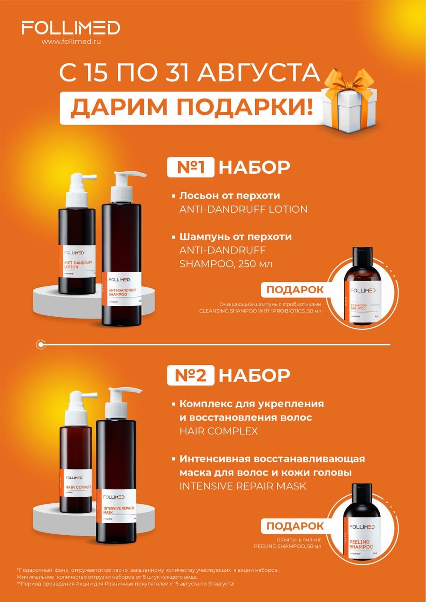 🎁 С 15 по 31 августа дарим подарки! Мы собрали эффективные дуэты и добавили к каждому подарок. Получите не только эффективный набор по уходу, но и попробуете новое средство бесплатно. 💖 Набор №1 — против перхоти — Лосьон от перхоти — Шампунь от перхоти 🎁 Подарок: очищающий шампунь с пробиотиками, 50 мл 💖 Набор №2 — для укрепления и восстановления — Комплекс для укрепления волос — Интенсивная восстанавливающая маска 🎁 Подарок: шампунь-пилинг, 50 мл Идеальный шанс попробовать глубокое очищение 🔜 follimed.ru 📱+79030047915 😌 Наш чат 😉 Youtube