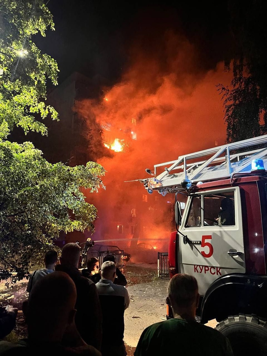 В результате атаки БПЛА ВСУ на многоквартирный дом в Курске пострадали десять человек, одна женщина погибла, сообщил врио губернатора Александр Хинштейн. Глава региона отметил, что серьезные повреждения получил дом по улице Союзной: на четырех верхних этажах возник пожар, пострадали квартиры.