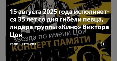 15 августа ,Вряд ли сегодня найдется человек, который не знаком с творчеством группы «Кино» и ее легендарным исполнителем Виктором Цоем. Увы, жизнь столь талантливого музыканта оборвалась так спонтанно.День памяти Виктора Цоя отмечают 15 августа, в годовщину его гибели в автомобильной катастрофе (15.08.1990 г.). В этот день многомиллионная аудитория поклонников творчества знаменитого советского рок-музыканта собирается в различных местах, связанных с его жизнью и творчеством, чтобы вспомнить своего кумира, исполняя его песни под гитару, а также зажечь поминальные свечи у памятной стены в его честь. На сегодняшний день такие объекты памяти существуют в России, Беларуси, Украине.15 августа песни группы «Кино» звучат во многих дворах, школьных стадионах, концертных площадках, их транслируют по радио. Существует множество проектов, посвященных памяти В. Цоя. Например, музыкальная группа «Виктор» перезаписала альбом «Звезда по имени Солнце» в новом звучании, в ежегодных памятных концертах